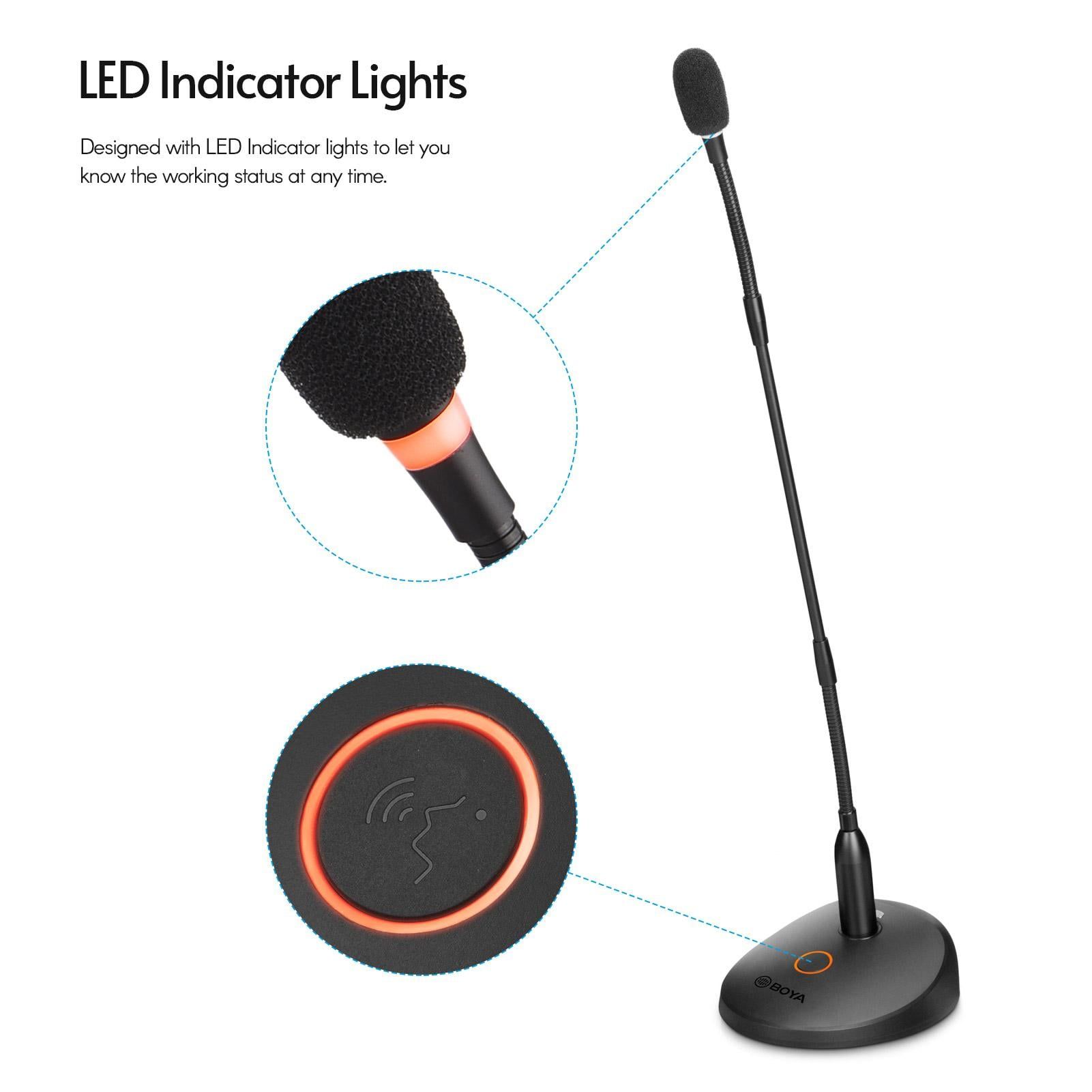 Features: Desktop condenser microphone designed for lectures, video conferences, meeting, etc. With excellent cardioid polar pattern, the microphone can clearly capture the voice in front of the mic. Flexible dual-section soft metal tube enables you to precisely position the capsule in front of the speaker for optimal sound. ON/OFF status is clearly indicated by the LED ring below the mic capsule, which let you know the working status at any time. The microphone can be powered by 2 * AAA batteries or XLR-48V phantom power(both are not included). with foam windscreen to eliminate noise effectively.