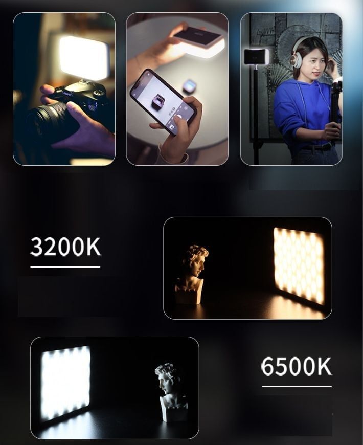 ◾ Cường độ có thể điều chỉnh từ 3200 đến 6500 K: nhiệt độ hai màu ấm và lạnh và độ sáng 10% - 100% có thể điều chỉnh trong một công tắc. Tất cả các nhu cầu như chân dung, thiên nhiên, YouTube và chụp trong nhà đều có thể đáp ứng được.