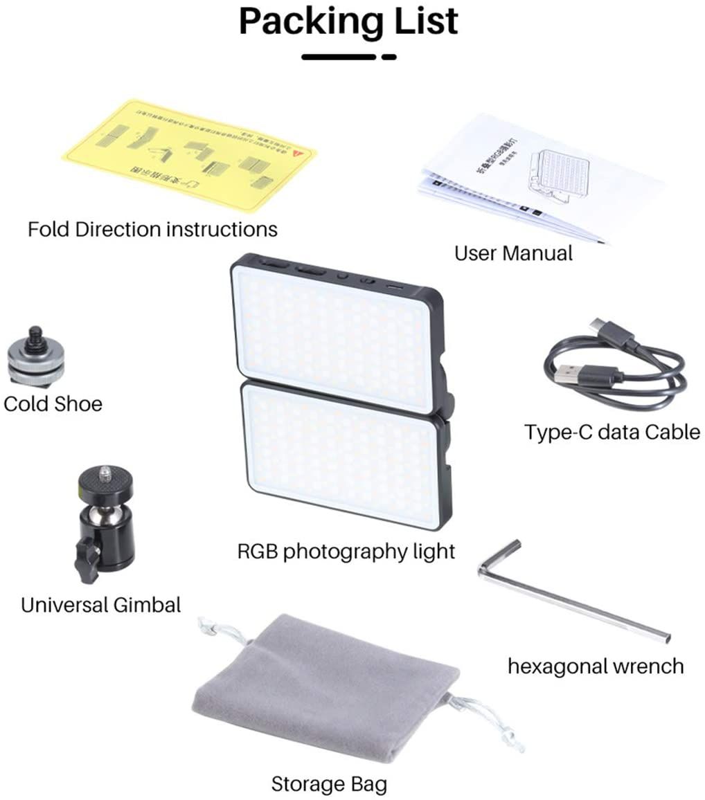 - Nhiệt độ màu: 2600-12000K Phạm vi độ sáng: 0% -100% Kích thước: 4,92 inch x 2,83 inch x 1,22 inch. Trọng lượng: 13,05 oz. Dung lượng pin: 7.4V 3200mAh. Thời gian sạc: 180 phút. Thời gian làm việc: 105 phút với hai bảng ánh sáng; 165 phút với một bảng điều khiển (thời gian làm việc có thể lâu hơn 105/165 phút khi độ sáng dưới 100%) có thể xoay: Nhiều góc cho cả hai hoặc gấp