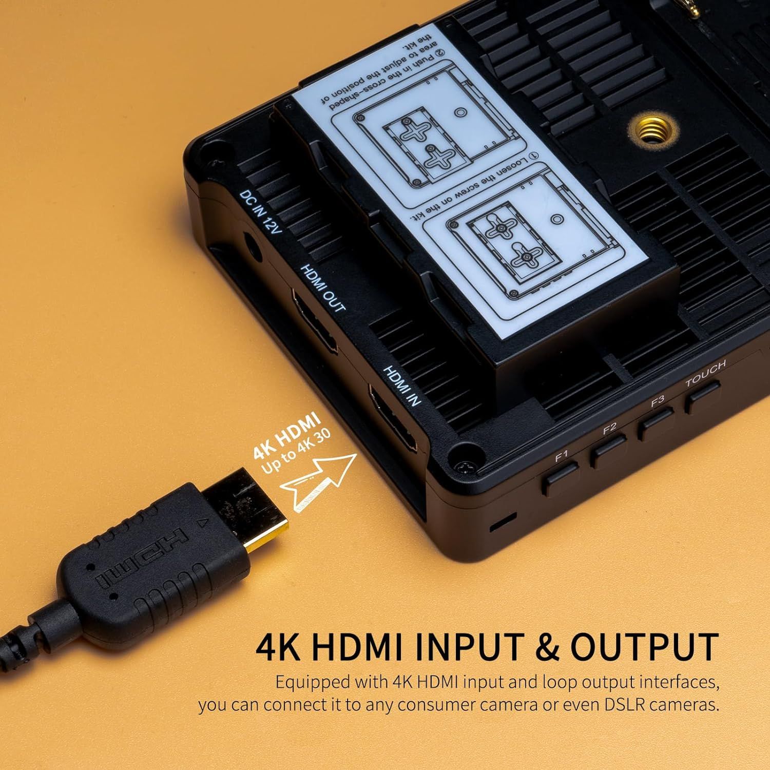 - [Bộ nguồn và cài đặt bên ngoài F970] Thiết kế bộ nguồn và cài đặt bên ngoài F970 được thêm vào mặt sau của màn hình. Bộ phụ kiện bên ngoài có thể được sử dụng để cài đặt và lắp đặt thiết bị bên ngoài, như hộp số không dây, đèn LED, bộ chuyển đổi video và các thiết bị khác có thể được cấp nguồn bằng F970.
