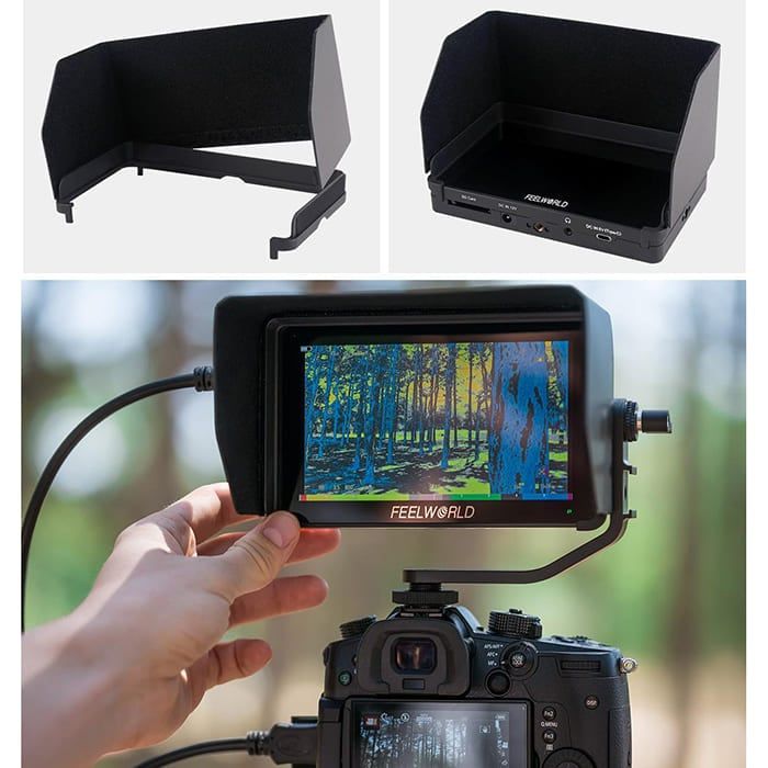 - Đi kèm theo mỗi Monitor Feelworld F6 Plusx là một tấm che nắng di động. Tấm che này sẽ giúp người dùng tập trung hơn vào video và tránh được sự can thiệp của ánh sáng mạnh, mang lại trải nghiệm hình ảnh tốt hơn. Quá trình lắp đặt đơn giản và nhanh chóng, rất thích hợp để quay ngoại cảnh.