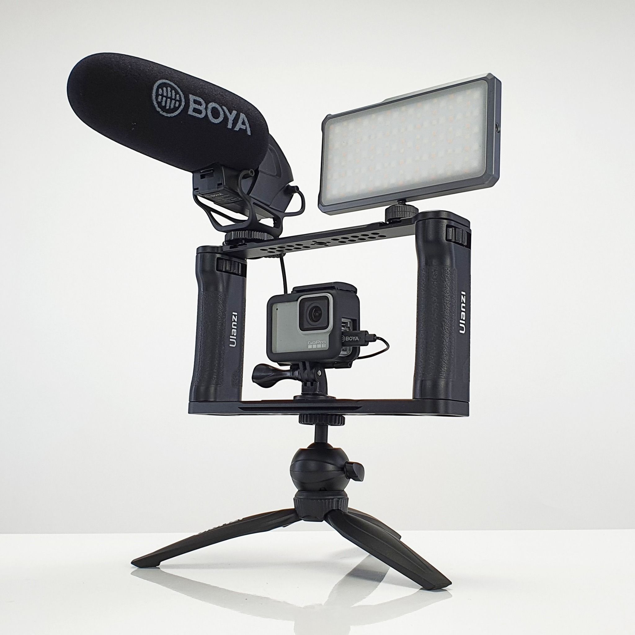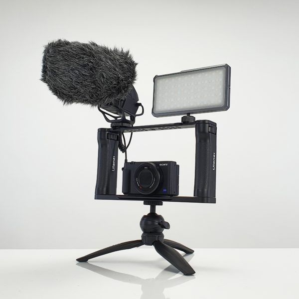4/ BỘ KHUNG CẦM TAY DÀNH CHO ĐIỆN THOẠI/ GOPRO – ULANZI R069: – 1 khung quay video dành cho điện thoại di động, tương thích với hầu hết các điện thoại thông minh/ Gopro để làm phim di động, vlog, quảng cáo, v.v. – Bộ sản phẩm đi kèm x2 tay cầm bên để quay phim bằng điện thoại cầm tay ổn định hơn. – Khung có 2 Cold Shoe Mount và nhiều lỗ ren 1/4 để gắn các phụ kiện như Micrô, đèn LED, chân Tripod, v.v.
