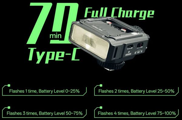 Pin tích hợp 1800mAh cho khoảng 650 lần chớp ở full power và sạc đầy trong ~70 phút qua USB-C. Bạn có thể kết nối powerbank để vừa dùng vừa sạc, đảm bảo không gián đoạn suốt buổi chụp dài.